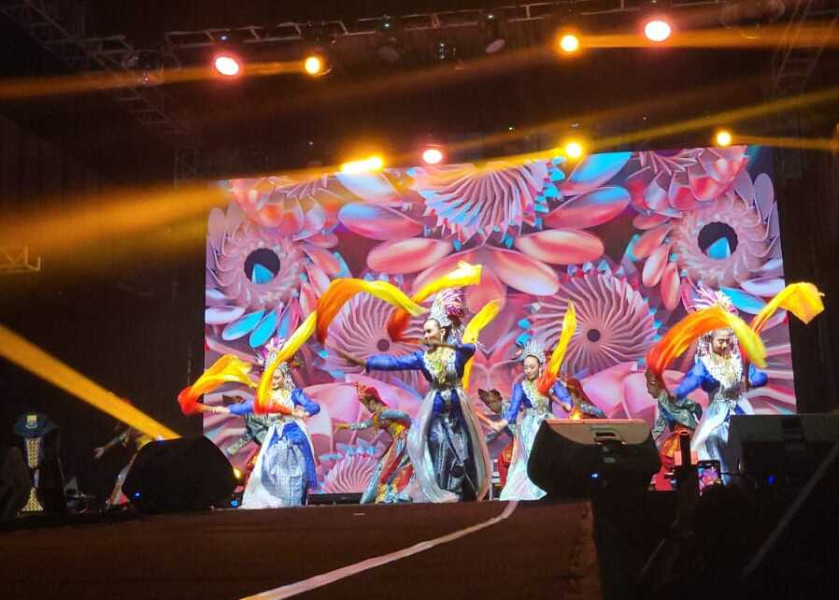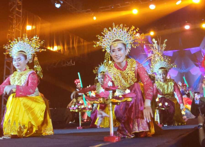 Tari kreasi yang memadukan ragam budaya Jambi ditampilkan pada pembukaan Kenduri Swarnabhumi 2023, menghadirkan harmoni gerak dan warna sebagai cerminan kekayaan tradisi daerah.