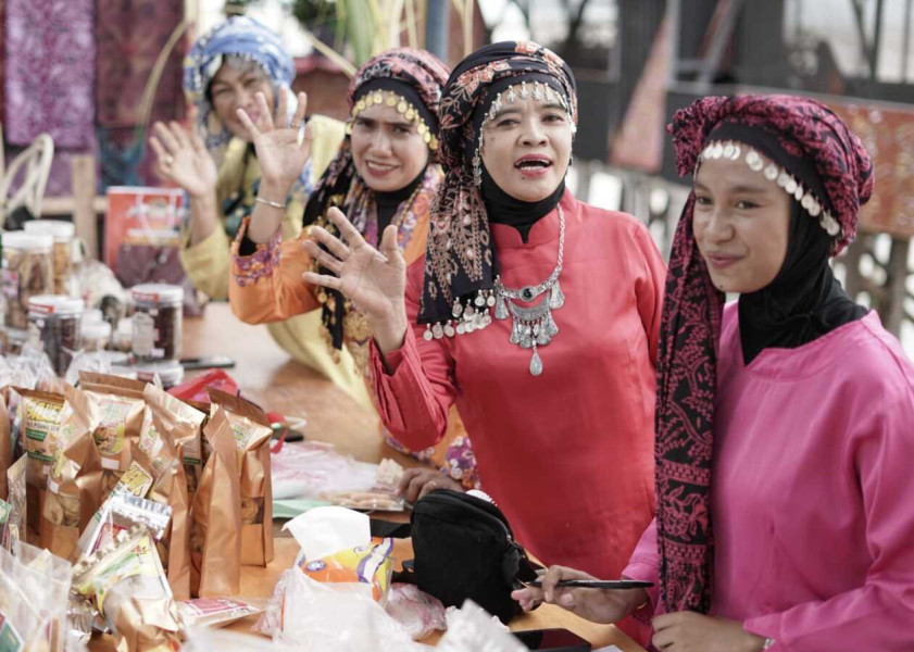 Beberapa peserta bazar makanan tradisional mengenakan baju adat Jambi tampil anggun dalam rangkaian Kenduri Lawang Swarnabhumi 2022, memperlihatkan keindahan warisan budaya daerah.