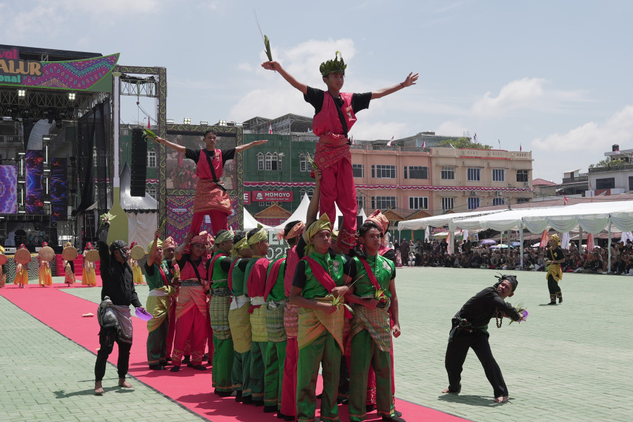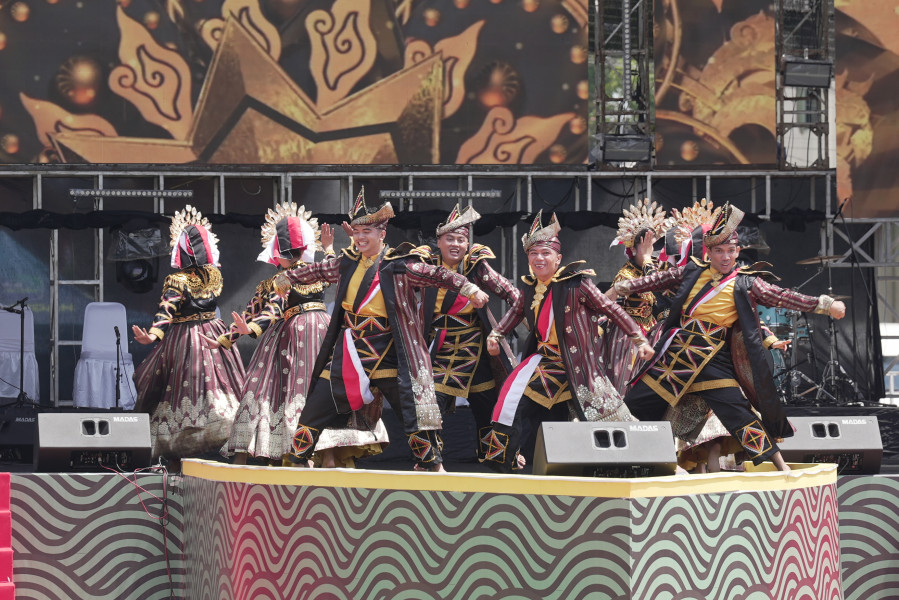 Tari massal memeriahkan pembukaan Festival Pacu Jalur 2025 di Tepian Narosa, Kuantan Tengah, Riau, menampilkan semangat kebersamaan dan kekayaan budaya masyarakat setempat.
