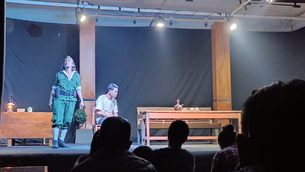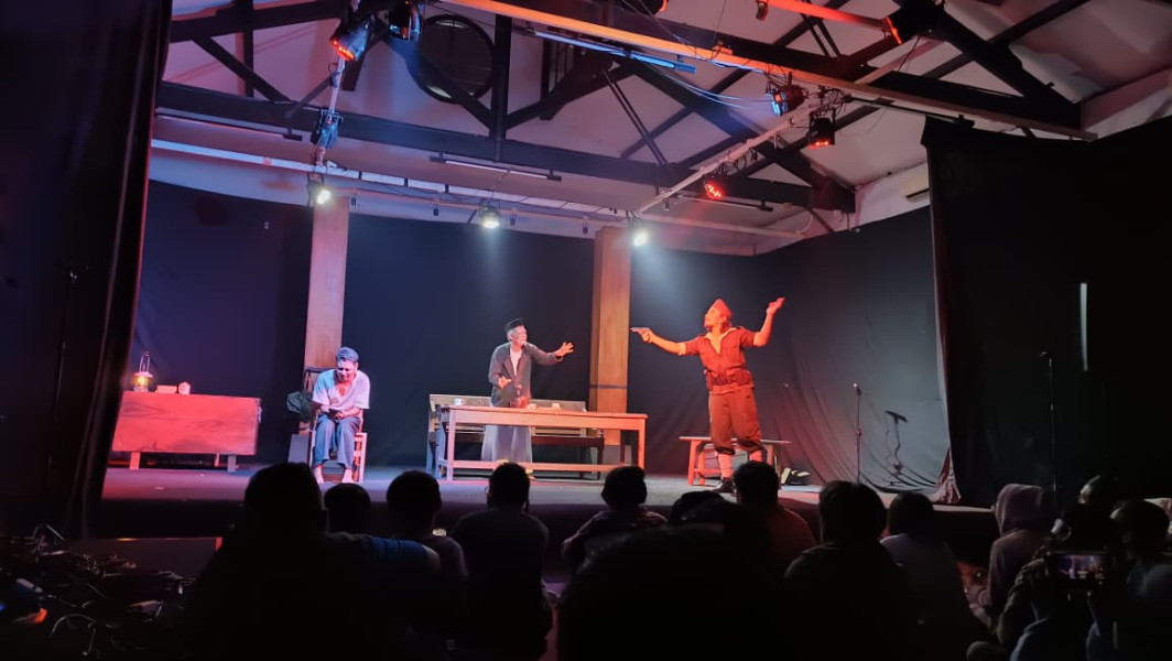 Musik perlahan melirih. Lampu mulai menatah panggung dengan lebih tegas. Set panggung tampaknya sengaja disentuh dengan sederhana tapi presisi: sebuah meja panjang yang berpasangan dengan kursi ditempatkan tepat di tengah panggung. Di sisi kanan, sebuah meja kecil dengan lampu sentir menyala. Ini menjadi detail kecil yang justru menghadirkan keintiman ruang, seperti mengajak penonton masuk ke sebuah masa lalu yang belum terjawab kejelasannya. Cahaya kuning redup dari lampu sentir itu memberi kesan bahwa cerita yang akan hadir tak hanya tentang peristiwa, tetapi juga tentang tanda tanya yang patut dinanti jawabannya.